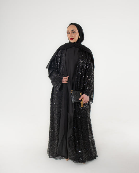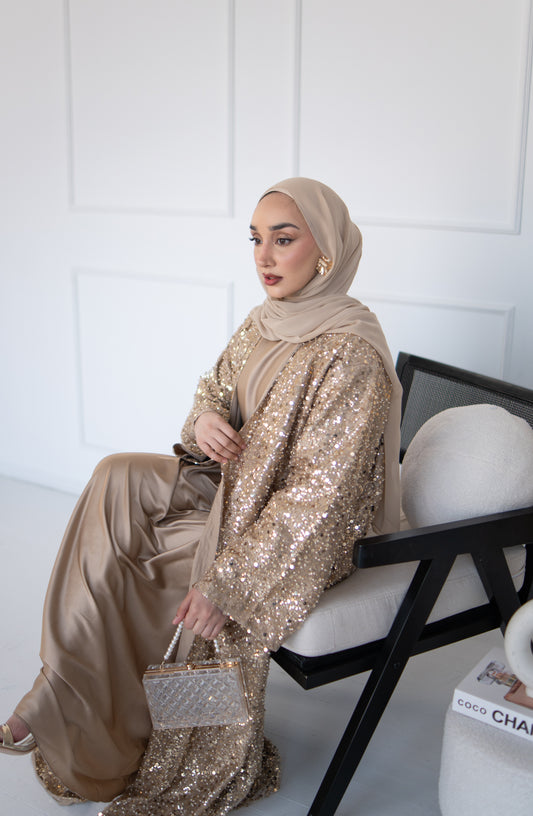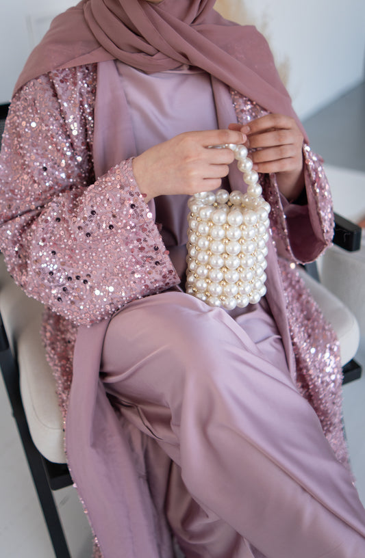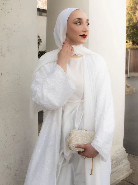 Elevate your wardrobe with our luxury 4 piece pearl abayas, made from the finest bridal materials creating a luxury feel. This set includes a matching longsleeve slip dress in case the abaya needs to be removed, a belt for preferred fitting & finally a chiffon hijab.